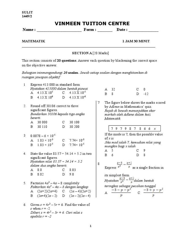 Masa menjawab adalah 30 minit. Home Layout 1. Contoh Soalan Matematik Tingkatan 1 Kssm.